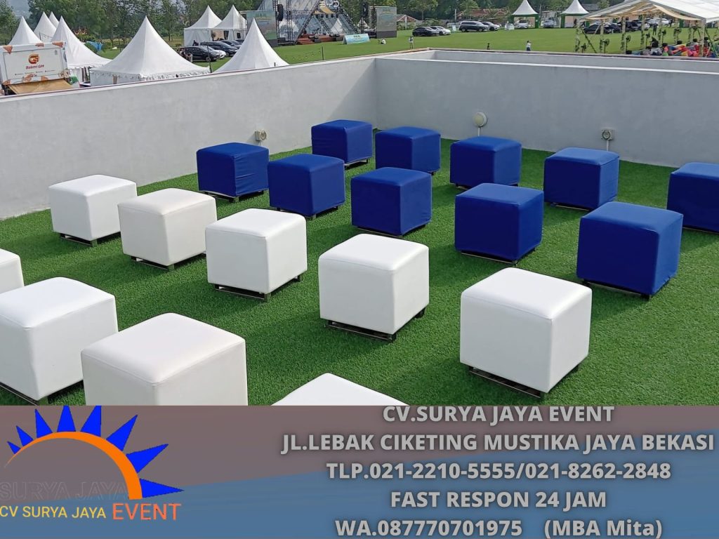 Sofa puff dilengkapi dengan cover biru tersedia dijasa sewa kami dengan ketersediaan stok yang melimpah, tentunya akan lebih memudahkan anda yang akan menyewa baik dalam jumlah berapapun, tidak dibatasi untuk itu, siap menyediakannya untuk anda.