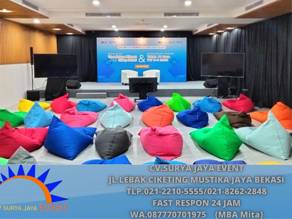 Beanbag tersedia dengan varian warna dan stok melimpah, pastinya akan lebih memudahkan anda yang akan menyewa baik dalam jumlah berapapun, tidak dibatasi untuk itu, siap menyediakannya untuk anda.