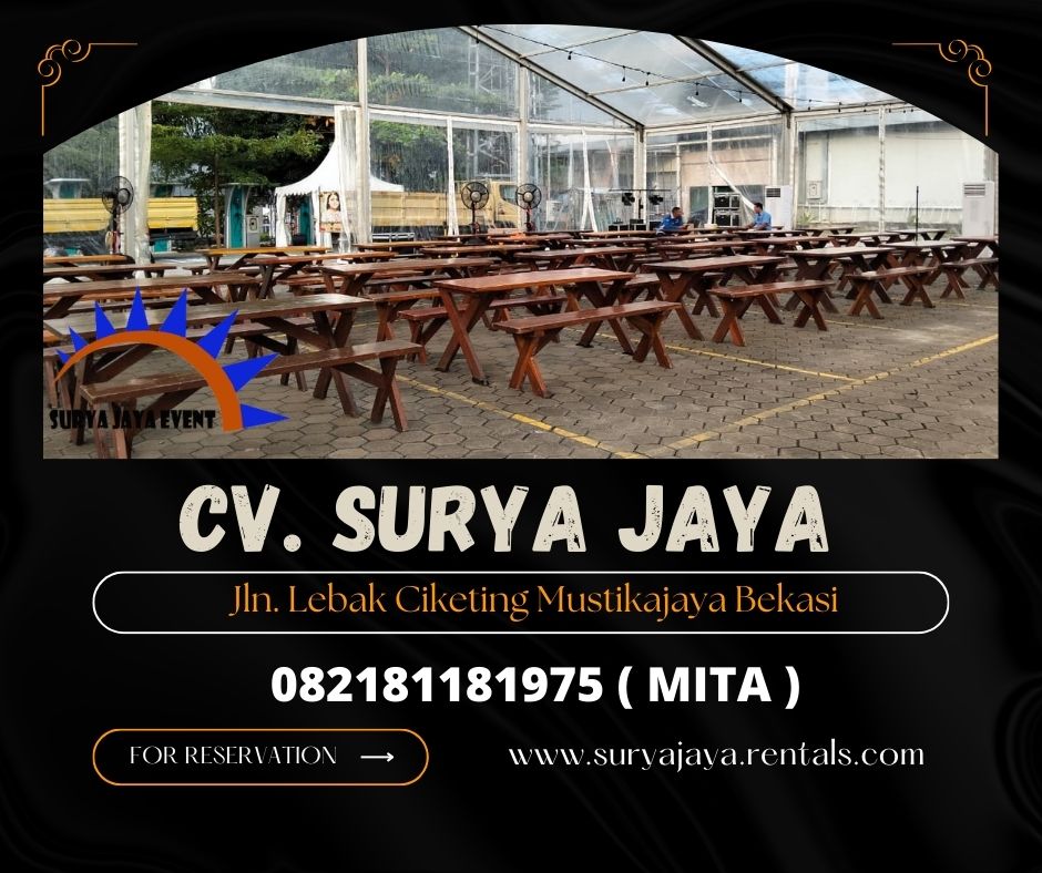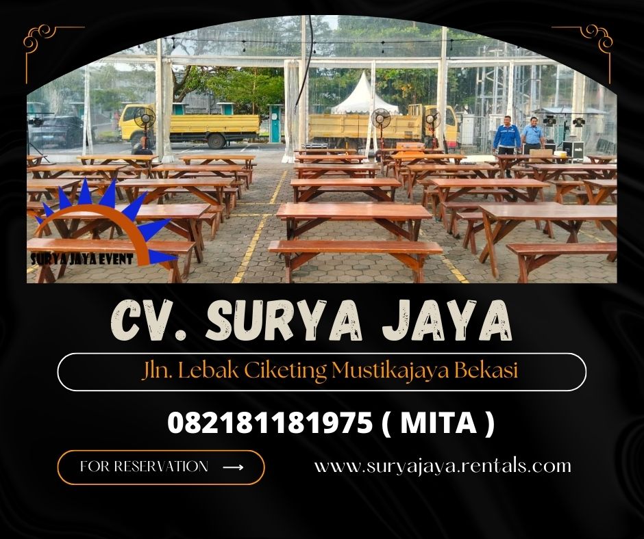 CV. SURYA JAYA EVENT ini menyewakan berbagai jenis alat pesta lengkap termasuk meja dan kursi taman yang memiliki kualitas produk yang bagus dan mewah siap kirim area jabodetabek dan sekitarnya.